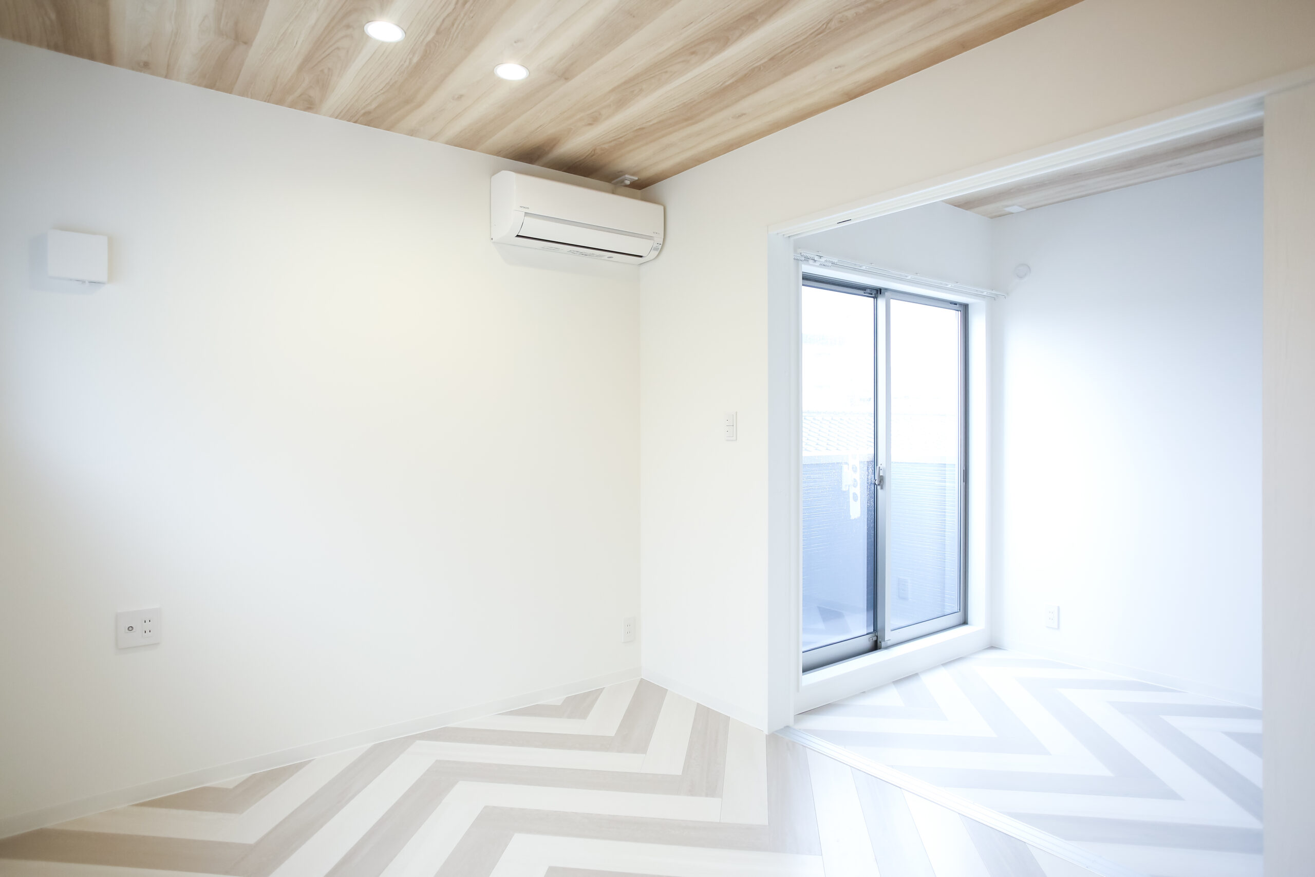 キッチンとリビングの間仕切りにはパーテーションウォールを使用。水回りと生活空間を緩やかに分けつつ、圧迫感がないため視覚的にも広々と感じさせます。