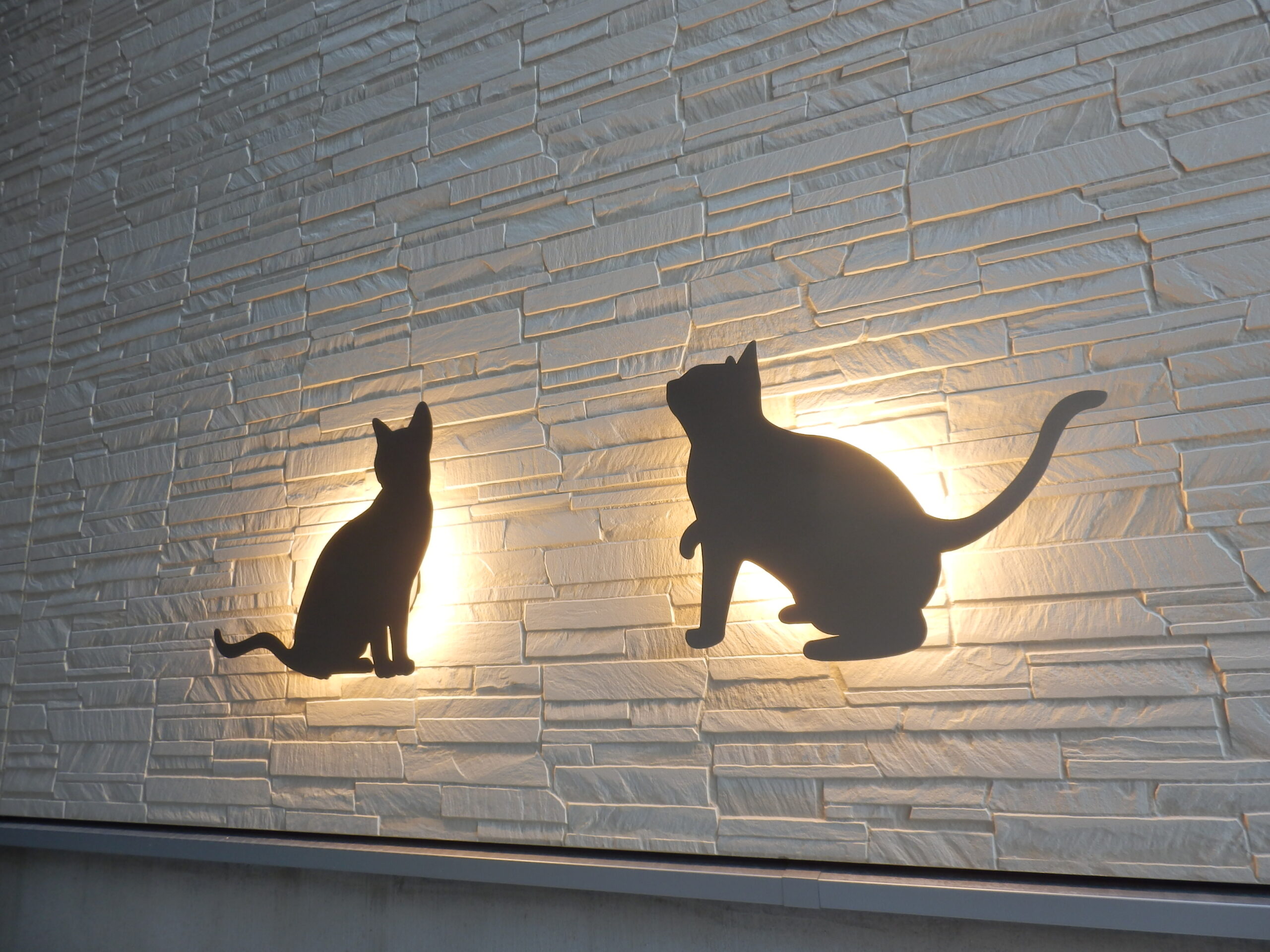 外壁にはネコ型のウォールライトを設置。外から見ても一目でネコプランだと分かります。